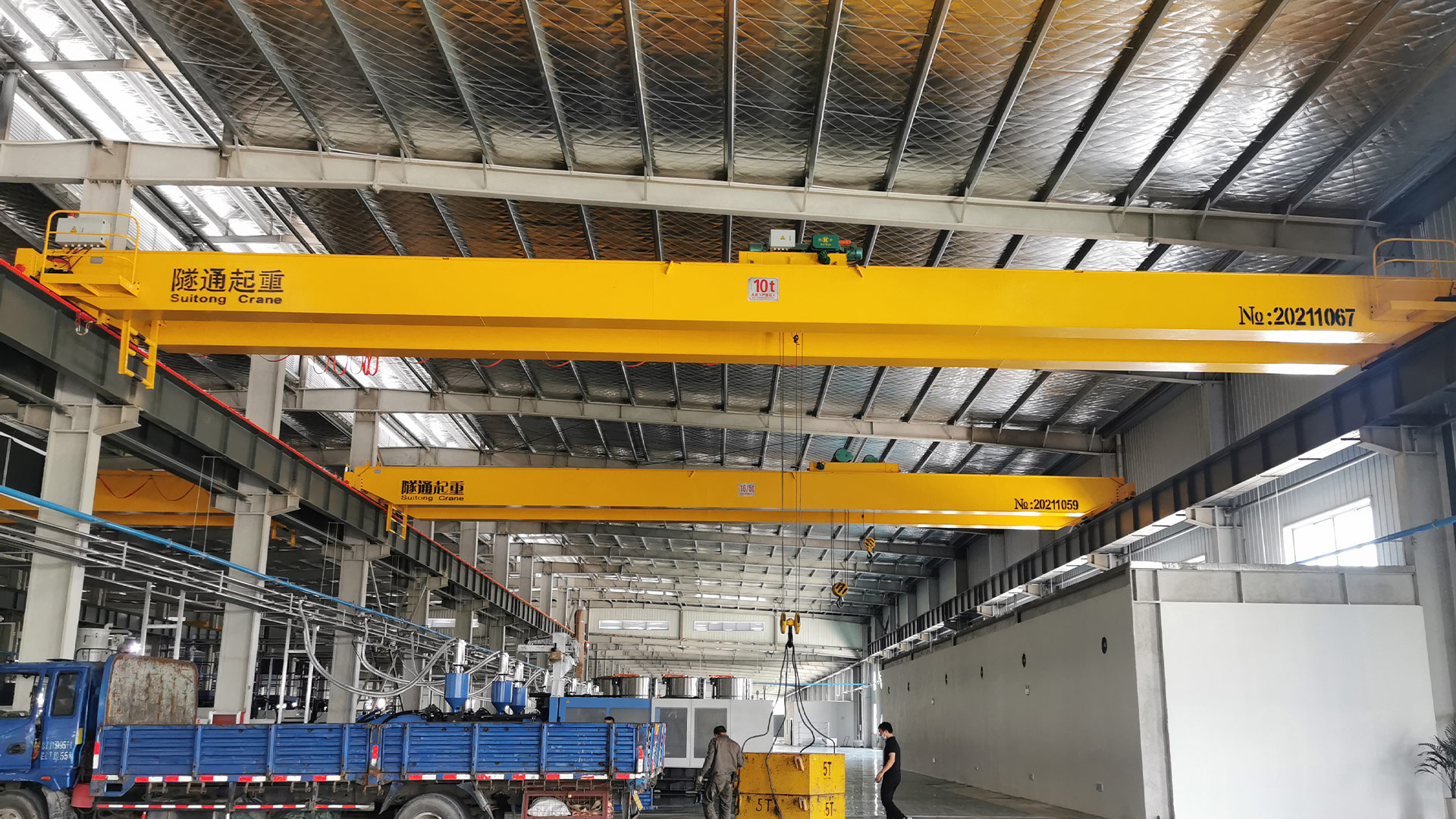 LH型電動(dòng)葫蘆雙梁起重機(jī)(雙梁行吊),主要由電動(dòng)葫蘆小車、橋架、大車運(yùn)行機(jī)構(gòu)和電氣控制裝置四部分組成,起升機(jī)構(gòu)采用固定式鋼絲繩電動(dòng)葫蘆,同時(shí)可以采用操縱室和地面遙控兩種控制形式,操作靈活方便,安全可靠;必要時(shí)可以加變頻控制。